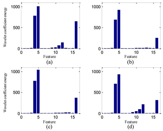 According to the four operating conditions of the generator, data is measured and recorded, sequentially. Each operating condition can generate 200 samples; the first 160 samples are taken for a training set and the latter 40 samples are taken as a testing set. The samples total 800, including the training set of 640 samples and testing data of 160 samples, shown in Table 1. Each data is a signal lasting for 0.5 s. According to Equation (5), does not have unit, and the energy spectrums of four operational conditions of each feature are shown in Figure 11.
