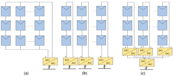 Different configurations for PV inverter topologies. (a) Central, (b) string, (c) multi-string.