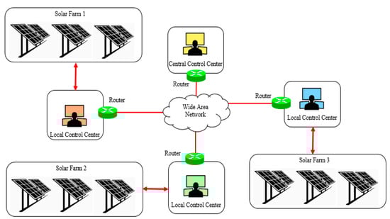 In PV power plants, supervisory control and data acquisition (SCADA) systems play an important role in the remote monitoring and control of field devices (sensors, smart meters, remote terminal units (RTUs), intelligent electric devices (IEDs), etc.) [19,20]. A typical SCADA system consists of data acquisition units, RTUs, communication networks, and system servers. Data acquisition units measure and collect monitoring parameters such as voltage, current, temperature, irradiance, etc., and then transmit it through the communication infrastructure to the control center. As the control center represents the core of the SCADA system, there are several application servers, such as front-end servers, historian servers, web servers and human–machine interfaces, where monitoring data are analyzed and visualized. The front-end servers are responsible for collecting data from the field devices, while the historian servers are used for data storage. Figure 2 shows the communication network for a PV monitoring system. Each local control center is dedicated to the monitoring and control of a PV power plant. All control centers are connected to a wide area network via routers.