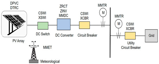 IEC 61850-7-420 standard defines the general data model for distributed energy resource (DER) systems. The standard describes the information model of the photovoltaic system including PV panels, conversion system, circuit breakers, protection devices, and metering devices. Figure 4 shows the architecture model of the photovoltaic system based on IEC 61850-7-420 standard [25]. A photovoltaic array controller (DPVC) and a PV tracking controller (DTRC) represent the logical nodes of the PV panels, as shown in Equation (1). In order to maximize the output power of the PV system, the output voltage and current are adjusted through the maximum power point tracking.
