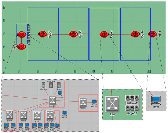Recently, the application of the internet of things (IoT), computer vision and unmanned aerial vehicle (UAV) have received great attention in remote monitoring of PV power plants. The authors in [13] presented an IoT architecture for remote monitoring of a solar photovoltaic system. The monitoring system consists of a PV module attached with different sensor nodes and measurement devices including pyranometer, voltage, current, temperature, humidity and video camera. The authors in [14] presented the application of computer vision and UAV for remote condition monitoring for photovoltaic systems. The system consists of a drone with a radiometric thermal camera and an algorithm for the detection of hotspots. The authors in [15] investigated hybrid communication networks for distributed energy resources (DER) with the focus on rooftop solar PV panels using network simulator 3 (NS3). The hybrid communication architectures included different technologies such as Ethernet, WiFi and WiMAX, and the performance was evaluated with respect to latency, throughput and packet loss rate. The authors in [16] presented modeling intelligent electric devices (IEDs) for different types of DERs based on IEC 61850 standard and simulation of communication configuration using OPNET Modeler for a microgrid system. The performance of the communication network was evaluated with respect to end-to-end delay and throughput.