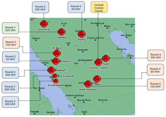 This work considers the planned PV power plants in Saudi Arabia based on the Renewable Energy Project Development Office (REPDO) [26]. Table 11 shows a list of the planned solar power projects across the kingdom. The projects have been divided into three rounds: round 1 includes one project (Sakaka PV project, 300 MW), round 2 includes six projects (1.47 GW) and round 3 includes four projects (1.2 GW). Al-Faisaliah project is the largest among them, with a generation capacity of about 600 MW. Figure 7 shows the locations of PV power plants. The solar PV power plants are distributed among different regions, where all projects will be connected to the national electricity grid.
