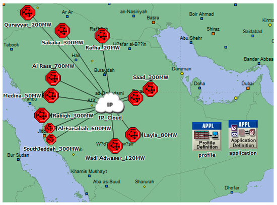 All PV power plants communicate with the CCC through the public communication network. Figure 8 shows the developed OPNET model for the grid integration of 11 PV power plants. The communication networks inside all subnetwork are configured as local area networks. Each subnetwork contains an Ethernet Switch, a workstation and a router. The communication among the subnetworks and the CCC is configured using the internet, which is represented by the internet protocol (IP) cloud. The communication links between each PV power plant and the IP cloud is configured with PPP-DS3 with a link capacity of 44.736 Mbps.