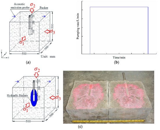 The conventional hydraulic fracturing performed by constant pumping rate: (a) cube test sample, (b) pumping process, and (c) hydraulic fracture morphology.