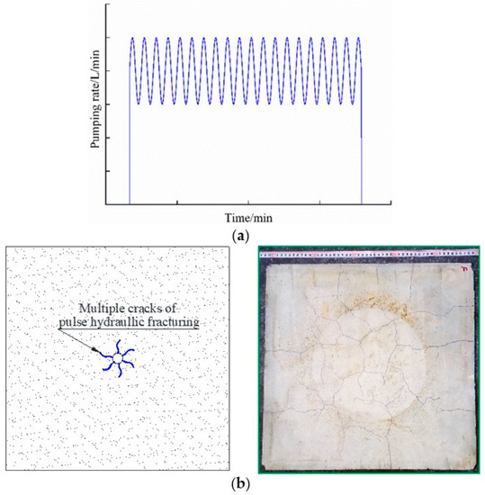 The hydraulic fracturing performed by pulse pumping rate: (a) pumping process and (b) hydraulic fracture morphology.
