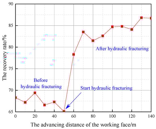 The recovery rate of the fully mechanized longwall top coal caving mining face before and after hydraulic fracturing is shown in Figure 14. Before top coal hydraulic fracturing, the top coal caving block is large and is difficult to be recycled from the coal outlet, which resulted in a recovery rate of only 67%. After top coal weakening construction by combining pre-pulse and constant pumping rate hydraulic fracturing, the caving block size of the top coal is reduced. The recovery rate reached 81% during the initial mining stage and then reached 85% during the normal mining stage. Compared with the recovery rate before hydraulic fracturing, it increased by 18% after hydraulic fracturing. The weakening technology by combining pre-pulse and constant pumping rate hydraulic fracturing has significantly improved the recovery rate of the fully mechanized longwall top coal caving mining face.