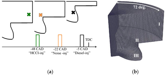 The in-cylinder domain is discretized with the finite volume approach and with a layering method stretching in the radial direction, ensuring a fine resolution in the near nozzle region. The sector geometry is shown in Figure 1, as a 72° part of the full geometry and with a finest mesh resolution of 0.30 mm and a maximum mesh resolution about 1.2 mm. In the figure, regions I), II), and III) correspond to the target points of the fuel spray injections, respectively for the first, second, and the third injections, which are also labeled as the HCCI, the noise and the diesel injections.