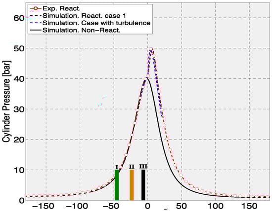 The intake valves are not considered in this work and instead the large-scale motions that are generated during the intake procedure are considered by the prescribed solid-body rotation flow. To investigate whether the turbulence fluctuations in the swirling flow play a pivotal role on the fuel and air mixing and combustion process, an initial turbulence field is superimposed to the mean swirling flow. The turbulence field is generated using the synthetic turbulent method developed recently [42]. The predicted pressure trace from the reacting case simulations employing the synthetic turbulence field is compared with the pressure trace for the baseline case 1, in Figure 2. In the case of initial turbulence with a root-mean-square of velocity fluctuation of 1.5 m/s, the intake temperature had to be increased by additionally 20 K compared with the case with no initial turbulence fluctuations, which corresponds to approximately a 10 K increase at the intake valve closing. It is seen from Figure 2 and Table 2 that the two pressure-rise rates are comparable, except a slightly higher pressure-rise rate for the case with the initial turbulence taken into account. The required higher initial temperature and the predicted higher pressure-rise rate are owing to that the temperature field and the stratification of the mixture are all relatively more homogeneous when turbulence is stronger. Nevertheless, the main source of turbulence production in the present DI PPC engine is the fuel injections. Considering the unknown turbulence fluctuation in the initial field in the experiments, to simplify the simulations the effect of background turbulence is compensated for by a slight increase of intake temperature in the following sensitivity studies.