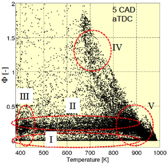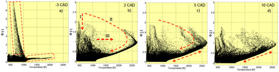 Furthermore, scatter plots of the cells in the physical space are presented in Figure 7 in the Φ-T space with the densely scattering region denoting high probability of finding the cells in the given Φ and T. At −2 CAD, the last injection has occurred, as shown by the fuel rich states in the left box. The first high temperature ignition can be seen in the box to the right. The fuel from the last injection mixes either with the ambient air at 3 CAD, cf. Figure 7b, without reacting (region I), or mixes and ignites with the ambient gas (region II). Meanwhile, the fuel and air mixture undergoes ignition around equivalence ratio 0.3–0.4 or ignites by mixing with the hot combustion gases (region III). At 5 CAD, cf. Figure 7c, there are rather rare fuel-rich mixtures seen due to mixing, and the equivalence ratio of the thermochemical states in the high-temperature manifold is decreasing as a result of mixing with the ambient unburned gas, in the direction as indicated by the arrows. At 10 CAD the reaction occurs mainly at Φ~0.7 and below approximately 2000 K. The ignition events shown in Figure 5, Figure 6 and Figure 7 help explaining the slow pressure-rise rate process that is typical for the PPC combustion engines.