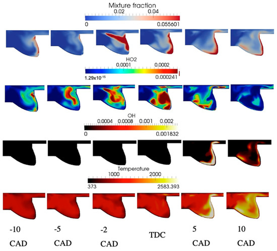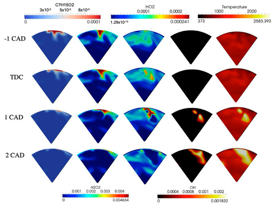 Furthermore, from Figure 4 it is observed that HO2 and H2O2 do not co-exist at high mass fraction levels (however note the magnitude difference in the legend) in the same regions. This is consistent with Equation (2) that HO2 reacts to form H2O2. When ignition occurs, between TDC and 1 CAD in the given cross-section, H2O2 and HO2 individually have very high local values compared with the surroundings and when they finally are entirely consumed, the high-temperature species OH appears. As OH is represented in the high-temperature chemistry regime, OH is encompassed with a high temperature, shown in column 5 in Figure 4. At TDC it is seen that the first OH sites correspond to the regions where both HO2 and H2O2 are consumed. The ignition and the reaction fronts are thereafter propagating towards the fuel impingement region, and also transported in the azimuthal direction, along with the swirl motion.