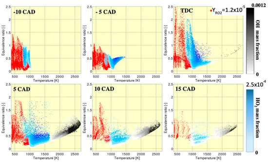 The combustion event for the entire engine, starting from low-temperature reactions to the high-temperature reactions, is shown in Figure 6 in the Φ-T space. At 10 CAD bTDC mainly the low-temperature chemistry is occurring, below approximately 1000 K (solid red dots) with some HO2 (bright blue to dark blue color) seen between 800 K and 1000 K. As the temperature of the cylinder increases by the compressive work from the piston and by the chemical reactions before the start of the last injection at 5 CAD bTDC, HO2 is extended towards the higher temperature regions around equivalence ratio of 0.5. Around TDC at this equivalence ratio, the first indication of high-temperature reactions appears with OH (white to black color) as well as elevated levels of ignition chemistry over a range of equivalence ratio owing to the last injection. Between 5 CAD and 10 CAD, the main-stage heat release occurs under mainly fuel-lean conditions, around equivalence ratio 0.5 and 1.0, but also in the slightly fuel-rich mixtures, with the highest mass fraction of OH at equivalence ratio about 0.8 and temperature 2700 K. The entire main-combustion event under the current conditions is approximately 15 CAD, as also seen in the pressure trace in Figure 2.