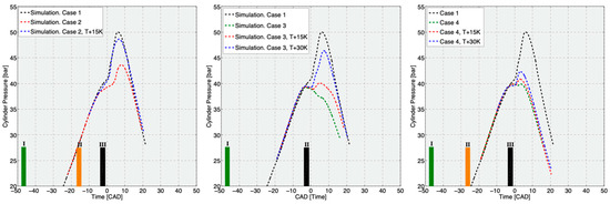 Predicted pressure traces for cases 1–4 at various adjusted initial temperatures.