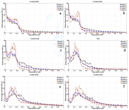 Volume-weighted PDFs for fuel and air mixture distribution as a function of equivalence ratio, for the four cases between −15 CAD and 10 CAD. (a) 15 CAD bTDC; (b) 10 CAD bTDC; (c) 5 CAD bTDC; (d) TDC; (e) 5 CAD aTDC; (f) 10 CAD aTDC.