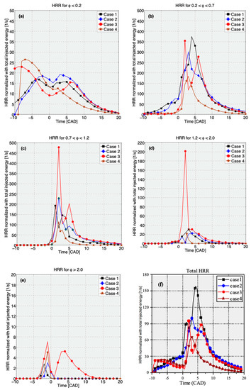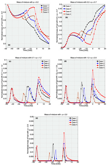 It is seen that HRR for the mixtures within 0 < Φ < 0.2 is rather low (as compared with the other mixtures, cf. Figure 10a,b) and it is seen that almost 50% of the fuel mixtures are within this range for all cases. Between the four cases, case 1 exhibits the lowest percentage of fuel mass in this range. The highest HRR is found for cases 3 and 4, which have high amounts of fuel in this region. Owing to the last fuel injection, the contribution of the heat-release in this mixture range is lower after −5 CAD, as the percentage of fuel in this interval is lower. Overall, the reactiveness of the fuel in this interval is lower, and thus it does not contribute significantly to the global heat release in all cases.