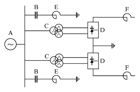 Electromagnetic disturbance sources distribution in the converter station. (A) Electromagnetic disturbance signals generated by generators and switchgear in power plants. (B) The electromagnetic disturbance signal generated by the isolation switch, switch, capacitor, etc. in the line. (C) High-energy surge pulse generated by the excitation inrush current when the transformer is switched on and off. (D) High-frequency pulses and surge impact signals generated by power electronic equipment, such as thyristors during transient conversion. (E) Magnetic field disturbance generated in steady-state operation of the line, and high-frequency disturbance generated in a fault state. (F) High-frequency disturbance signal generated by bus switching.