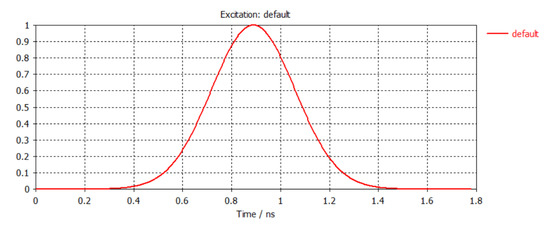 For far-field disturbance, the plane wave can be utilized to simulate. Its propagation direction is set to (0,0,−1) and electric field direction to (1,0,0). The plane wave excitation is set to Gaussian pulse, as shown in Figure 2. The simulation model is shown in Figure 3.