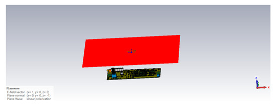 Theoretically, it is possible to place the wire antenna and the PCB in the same space for simulation, but this will divide the simulation space into tens of millions of grids, which greatly extends the simulation time. Therefore, for the purpose of appropriately reducing the time required for the simulation, the simulation ideas are now improved. As shown in Figure 5, the disturbance generated by the wire antenna itself is solved by simulation first, and then the simulation result as a near-field source is imported into the CST. At last, it is simulated with the PCB board, which not only improves the speed of simulation but also guarantees the rationality of simulation results.