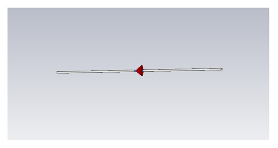 The near-field disturbance source model is simulated by a pair of dipole wire antennas [17,18], which consist of two PEC cylinders (ideal metal conductors). The gap between the two cylinders is 2 mm. A port is added in the gap between the two PEC cylinders, where a Gaussian pulse signal with an amplitude of 1 V/m is applied, so that the antenna can radiate electromagnetic fields outward, as shown in Figure 4.