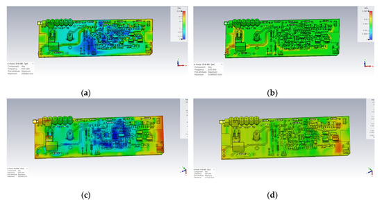 (a) Electric field distribution diagram under far-field disturbance; (b) Magnetic field distribution diagram under far-field disturbance; (c) Electric field distribution diagram under near-field disturbance; (d) Magnetic field distribution diagram under near-field disturbance.