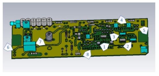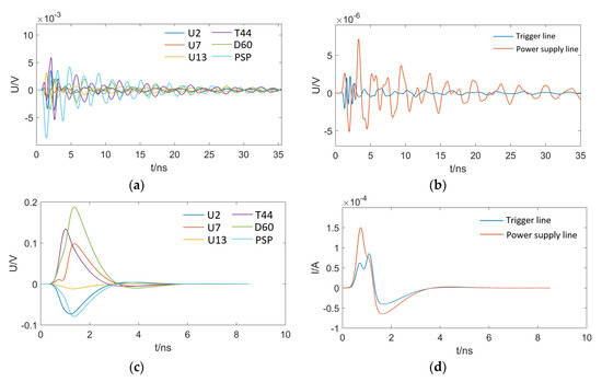 From Figure 6, the electric and magnetic field distribution diagrams under far-field disturbance and near-field disturbance, it can be seen that the electric field intensity at the left and right ends of the board, some lines, and some chips is relatively large, and the magnetic field strength at the power supply line and part of the trigger line is relatively high. Based on the several places mentioned above, voltage probes are set at the voltage comparator U2, the double JK trigger U7, the monostable trigger U13, the transistor T44, the transistor D60, and power supply port (PSP), where the electric field strength is relatively large, to monitor the changes in the induced voltage. Current probes are set at the large power supply lines and trigger lines to monitor the changes in induced current. The eight probes mentioned above are numbers 1–8 in Figure 7, respectively.