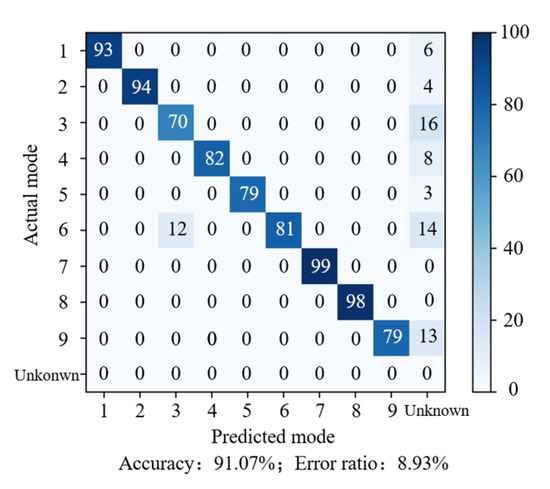 It can be calculated from the confusion matrix in Figure 13 that the accuracy of pattern matching is as high as 91.07%, and the error ratio is 8.93%. After completing the pattern matching, calculate the failure mode probability corresponding to the real-time exception information vector so as to perform failure prediction.