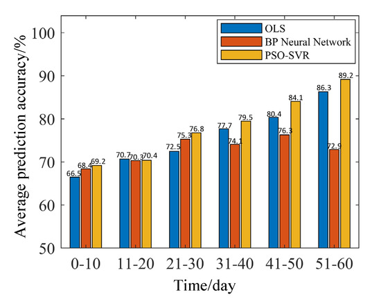 Figure 14 shows the comparison of prediction accuracy after running the model on the target system for 60 days. Yellow corresponds to the method proposed in this paper, blue represents the ordinary least squares (OLS) method [26], and red corresponds to the traditional neural network method [27]. As can be seen from Figure 14, as time goes by, the average prediction accuracy of this method is also steadily increasing. In the beginning, the three methods take the same data; therefore, the average prediction accuracy of them is very close. However, as time and the electromagnetic environment changes, new failure modes of TCU occur, which are difficult to identify with traditional neural network methods. Different from the traditional method, the method proposed in this paper and the OLS method can add unknown failure modes to the failure mode library for use in the next similar failure. Therefore, the prediction accuracy gradually increases in the middle and late stages. Compared with the general OLS, PSO-SVR in this paper has the advantage of always having the global optimal value in the training process. Additionally, the generalization ability of PSO-SVR is strong, the solution space is sparse, and the convergence speed is fast. The calculation example also proves that the method in this paper is slightly better than the traditional OLS regression method.