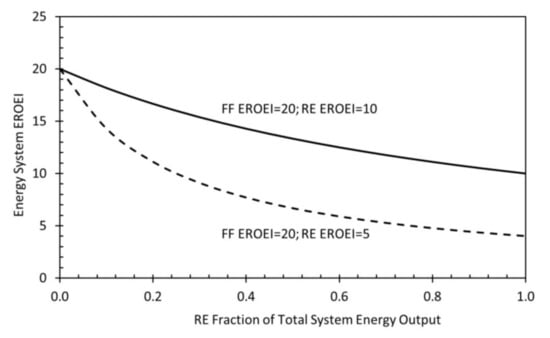 Energy system energy return on energy invested (EROEI) for a fixed fossil fuel (FF) EROEI of 20 and renewable energy (RE) EROEI values of 10 and 5 as a function of RE in the total system energy output.