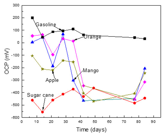 The effect of the ethanol source on the variation of the OCP value with time for Al in the different ethanol–gasoline blends are shown in Figure 2. The noblest values were obtained in pure gasoline, due to its high resistivity, as well as its low water and oxygen solubility. On the other hand, the most active OCP value was obtained in the blend made with ethanol obtained from sugar cane, which was probably due to higher water and oxygen contents. The OCP values obtained in the blends made with ethanol from oranges and mangos were very noble; however, after 30 days of exposure, their values became more active. A similar trend was observed for the OCP values obtained for the blend made with ethanol obtained from apples. The shift towards more active values was probably due to the dissolution of any air formed from the oxide layer, whereas the shift into the noble direction was due to the formation of corrosion product layers after metal dissolution [22].