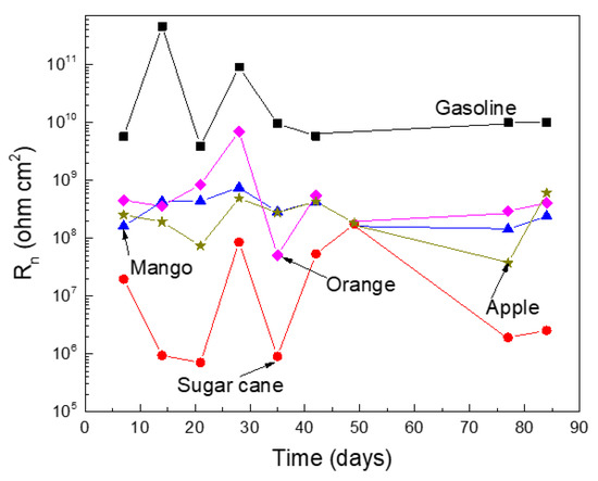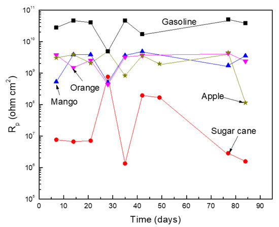 where K is a constant that involves cathodic and anodic Tafel slopes obtained from polarization curves not obtained in this study due to the high solution resistivity values. Figure 3 shows that the lowest Rp values, and thus the highest Icorr values, were obtained for the blend made with the ethanol obtained from sugar cane. The Rp obtained in blends made with ethanols obtained from either oranges, apples, or mangos were higher by at least two orders of magnitude than those obtained in the blend made with sugar cane ethanol. The highest Rp values, and thus the lowest Icorr values, were obtained from pure gasoline, due to its low water and oxygen affinity [21]. However, in all cases, regardless of the ethanol source, Rp values had erratic behavior with time, since sometimes it increased and other times it decreased.