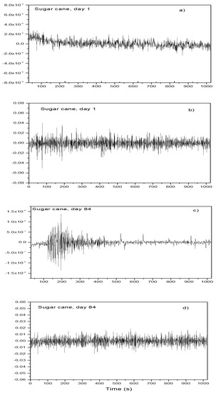 Noise in current and in potential for Al in the blend containing ethanol obtained from sugar cane after ((a) and (b)) 1 day and ((c) and (d)) 84 days of exposure.