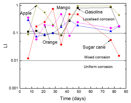 Obtained results are given in Figure 6. Metal had a high propensity to suffer from the localized type of corrosion when the LI value were between 0.1 and 1, where it would suffer from a uniform mixture and localized corrosion type if its value were between 0.01 and 0.1. Results shown in Figure 6 indicate that Al was highly susceptible to a localized type of corrosion, such as plotting, in all the ethanol–gasoline blends regardless of the ethanol source. For the blend containing ethanol made from sugar cane, these results indicated that Al could develop a mixture of localized and uniform type of corrosion.