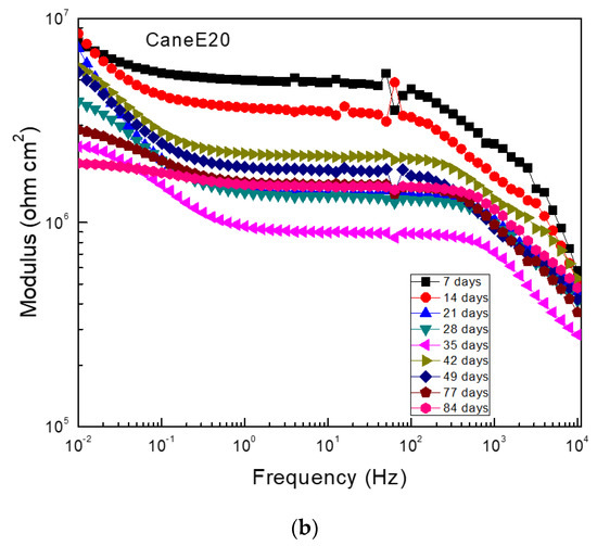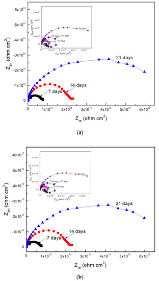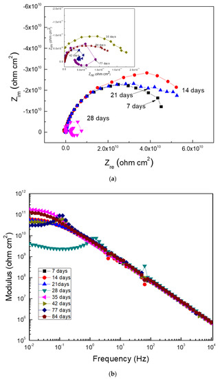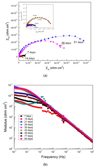 Data plotted in the Nyquist diagram shows a charge-transfer control since it observed one capacitive semicircle at all frequency values (Figure 7a). However, in some cases such as at 28, 42, and 77 days of exposure, an inductive loop at low frequency values appeared, which showed that the corrosion process was controlled by the adsorption/desorption of some intermediate compounds. The Bode diagram, shown in Figure 7b, indicated that the impedance modulus sometimes increased or decreased with time, which was indicative of the formation of the corrosion product layer and its detachment. The presence of two different slopes in this plot was also evident, thus indicating the presence of two time constants. Thus, in Nyquist plots, there were two different semicircle: one, at high and intermediate frequency values, due to the redox reactions that took place at the metal/corrosion products layer, and a second semicircle at lower frequency values, due to the redox reactions that took place at the metal/electrolyte interface (the double electrochemical layer). According to the Bode plot, the highest impedance modules were within the order of 1010 ohm cm2, which was similar to the Rp and Rn values reported above in Figure 4 and Figure 5.