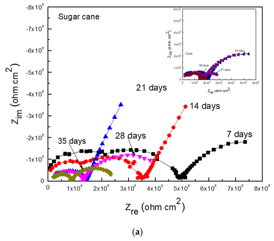 Finally, Figure 10 presents the Nyquist and Bode plots for Al corroding in the ethanol–gasoline blend containing ethanol made from oranges. The Nyquist diagrams (Figure 10a) show a single capacitive semicircle in the whole frequency interval, i.e., a corrosion process controlled by the charge transfer reaction; however, the presence of two slopes were observed in the Bode plots (Figure 10b). Thus, the two time constants indicated that there were two different capacitive loops: one at high and intermediate frequency values, which was associated with the electrochemical reaction that took place at the metal/corrosion product film, and a second capacitive low frequency loop, which was associated with the electrochemical reaction that took place at the metal/electrolyte interface or double electrochemical layer. However, after 35, 42, and 77 days of exposure, an inductive loop at the lowest frequency values following the high frequency loop was observed, indicating that the corrosion process was controlled by the adsorption/distortion of some intermediate species. Bode plots also showed that the impedance modulus values, in general terms, increased as time increased due to the formation of corrosion product films, and the existence of two different time constants: one corresponding to the electrochemical reactions that took place at the metal/corrosion products film, and a second one representing the electrochemical reactions that took place at the metal/electrolyte interphase or double electrochemical layer.