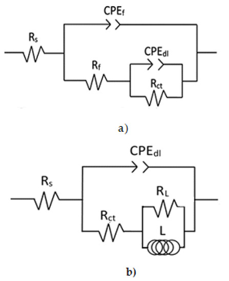 Electric circuits are commonly used to simulate EIS results and. in this case, the ones that had the best fit are shown in Figure 11, As such, their elements had a solution resistance, Rs, and charge transfer resistance, Rct, associated with the double electrochemical layer. Moreover, Cdl was the double layer capacitance that was inversely proportional; Rf had corrosion product film resistance and Cf was its capacitance; L was the inductor and RL its resistance. Polarization resistance, Rp, was the sum of all of these resistances, i.e., Rs + Rct + Rf. The double layer and corrosion products film capacitance value, Cdl and Cf, were affected by surface imperfections, such as roughness, which were made instead of a pure double layer capacitor, Cdl, when a constant phase element, CPE, was used [27]. The impedance of CPE, ZCPE, is given by [28]: