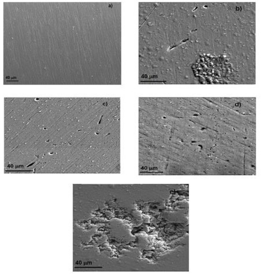 Figure 12 shows micrographs of Al corroded surfaces after 90 days of exposure to different ethanol blends. For the test done in pure gasoline, specimens did not show any type of attack, as can be seen in Figure 12a; however, for the tests carried out in blends containing ethanol made from oranges, apples, or mangos, some shallow plots with a size smaller than 10 μm could be seen. Even more, for the test carried out in the blend containing ethanol made from sugar cane (Figure 12d), the plot size was larger than 40 μm and deeper than those observed in other blends. Nonetheless, it was very likely that it was a coalescence of several smaller plots. Thus, these micrographs were in agreement with all the electrochemical tests results, i.e., that Al did not suffer from any type of corrosion attack in pure gasoline; that the ethanol made from oranges, apples, or mangos were more aggressive than pure gasoline; and that ethanol made form sugar cane was the most aggressive among the different ethanol tested in this research work, perhaps because of its higher oxygen and water contents than those in the rest of the ethanol obtained from oranges, apples, or mangos.