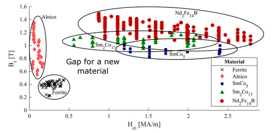 The PM characteristics in Table 1 are often relevant when designing electrical machines [25,26]. Other important aspects are chemical, mechanical and thermal properties, and cost. Furthermore, the second quadrant of the B vs. H hysteresis loop (H < 0, B > 0) is of high importance.