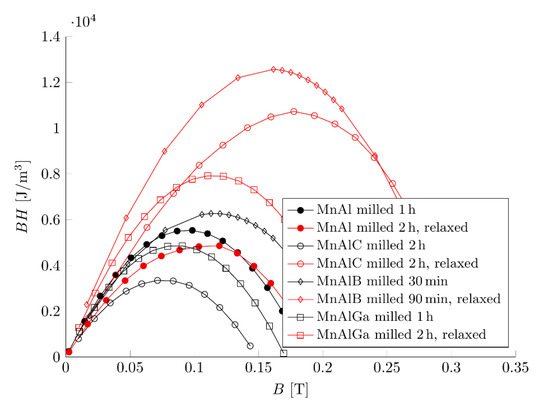 Energy product (BH) curves of MnAl and C-, B-, Ga-doped MnAl. The black lines are milled samples, and the red lines are milled and relaxed samples.