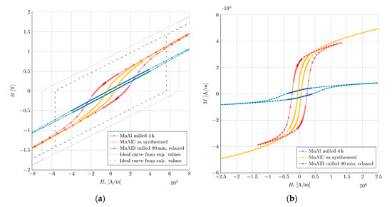 For the simulation, the theoretically calculated value of Ms for MnAl (presented as case 1 in Section 4) and the experimental Ms value of MnAlC (presented as case 2 in Section 4) were chosen due to a superior Ms. The ideal hysteresis curves are explained in Section 3. In Figure 3, the experimental hysteresis curve is shown, specifically of the MnAl samples of the highest saturation magnetization, highest coercivity, and the highest energy product reached in the experiments.