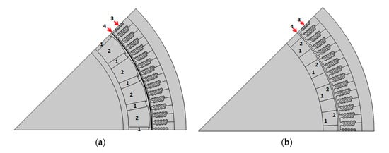 Generator topologies: (a) Spoke-type (b) Surface-mounted. 1. Permanent magnet, 2. Rotor pole 3. Stator slots with coils 4. Air gap.