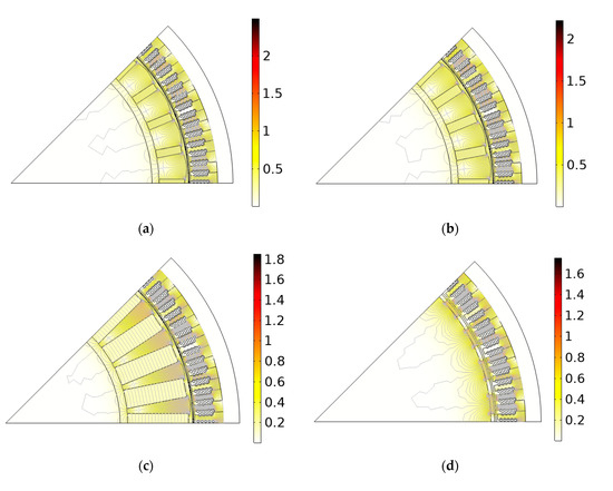 In Figure 5a,d, the simulated topology is presented for the four different cases. Figure 5a–c are spoke-type generators and (d) is surface-mounted. Note the different size of the PMs due to the different values of the (BH)max. The density, volume and weight of PMs affects the size and inertia of the generator and can be of great importance for a structure. The rotors with MnAl are heavier than the rotor with NdFeB, but much lighter than the rotor with ferrite PMs, as stated in Table 4. Figure 5 shows the size difference of the PMs, and that the magnetic flux is quite similar on the stator side.