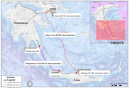 Geographical map of interconnections between Crete and the continental Greece power systems.