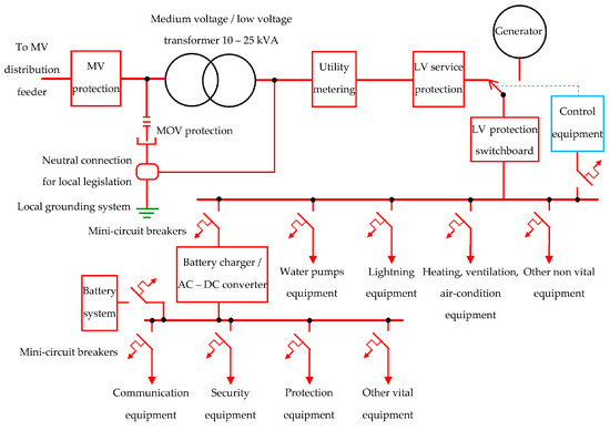 On the contrary the instructions for connection between the electrode station and converter station for electrode stations are limited. More specifically, the guidelines of CIGRE ([45], chapter 7) for the design of the electrode of HVDC stations are limited to the requirements for electrode site monitoring, station AC and DC services, and communication links to the HVDC station or to central supervisory facility. However, the guidelines do not take into consideration the type of the electrode, the number and type of monitoring systems required at the site for facilitating HVDC scheme operation, the electrode line monitoring scheme, and the utility or owners operational and maintenance practices. The respective proposed solution for the power supply of a shoreline electrode station for the Greek distribution network would be a low voltage feeder of 230/400 V, which can cover a demand lower than 150 kVA sufficiently. The off-site service will be typically a medium voltage (MV) feeder of 20 kV. A typical single line diagram for the station service of a site with a building and back-up diesel generator according to ([45], paragraph 7.2) is shown in Figure 2 satisfying the reliability criterion of “n + 1” power sources.