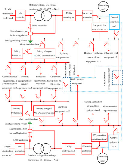 - HVDC interconnection with high reliability levels: The power supplies for normal and emergency operation are duplicated, which means that it will be two network feeders and two back-up sources, i.e., one generator and one big energy storage system or two generators. The vital loads for the HVDC interconnection, such as the control system, communication system, heating–ventilation–air condition (HVAc), etc., should be duplicated. For example, the programmable logic controller (PLC) system for the HVDC electrodes switchgear control is constructed by two similar units, which operate in the master–slave mode and their power supply is realized by two different power sources. Similarly the HVAc system for the main electrode station room consists of two units, where each one can cover the heating/cooling load completely. The essential loads, i.e., water pumps, can be supplied by two sources, while the non-essential loads, i.e., sockets for cleaning/maintenance purposes, can be divided to the two sources. Additionally, the proper circuit breaker between AC buses or DC buses must exist for alternative supply of essential and non-vital loads. The basic idea is presented in Figure 3.