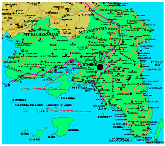 - Map of Attica Greece. Available online: https://www.in2greece.com/mappages/stereaellada/attica.htm (accessed on 2 August 2020).