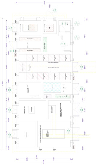 Taking into consideration the aforementioned circumstances the electrode station can be supplied either by a medium voltage three phase cable from Aegina through a step down transformer and having a back-up diesel generator power plant and a proper back-up energy storage system of at least for 48 h, or by an autonomous power system. The first solution requires the architectural design of Figure 5, which includes the main electrode station room, the Hellenic Electricity Distribution Network Operator’s (H-EDNO) medium voltage switchboard room, the electrode station medium voltage switchboard room, a transformer room, a low voltage switchboard room, a control/accommodation room, a battery room, a back-up diesel generator room, a storage room, a water and pump room, a water closet (W.C.), etc. The sheltered solution for the distribution connection equipment has been chosen for sea salinity protection.
