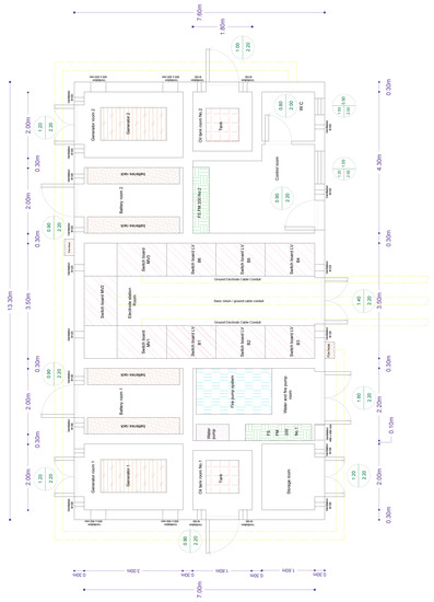 Alternatively, the autonomous system can involve PVs, two batteries subsections and two back-up diesel generators according to the reliability criterion of “2 × n” power sources (see Section 2.2). Wind generators cannot be used, because Stachtoroi is a protected sanctuary for seagulls. The PVs should be suitable for marine applications because they are put near to the seaside (5–10 m from the shore). The batteries can be valve regulated lead acid (VRLA) ones or AGM ones, but not classical flooded lead acid ones because of the maintenance issues or lithium-ion ones because of serious difficulties in the case of fire, which is why the National Fire Protection Association (NFPA) rules propose a small capacity of 50 kWh per fire protective segment [53]. For the same fire risk reasons, solutions as hydrogen tanks are not proposed, while a hydro-pumped storage plant cannot be placed because of a small height difference in the island. The respective architecture solution is presented in Figure 6, which includes the main electrode station room, the control/accommodation room, two battery rooms, two back-up diesel generator rooms, a storage room, a water and pump room, a W.C., etc.