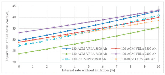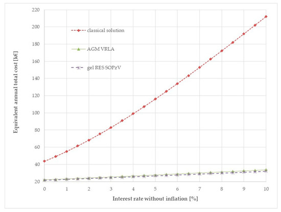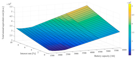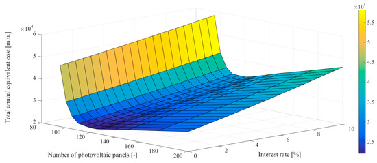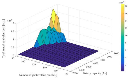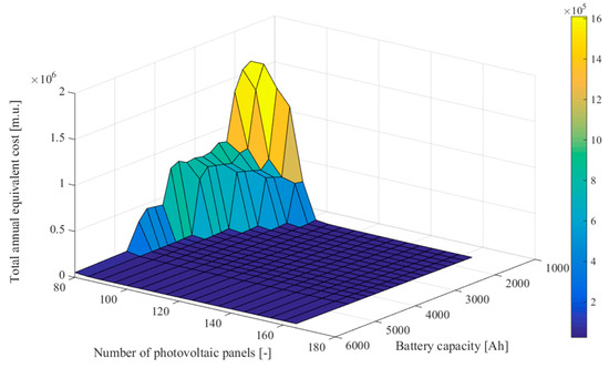 - The proposed sensitivity analysis, which is based on the variation of the equivalent annual total cost with respect to (a) the size of the PVs and of the batteries for every possible type combination of PVs and batteries and (b) the interest rate without inflation. The parametric interest rate allows the evaluation of the stability of the configuration of PVs and batteries for different financial scenarios.