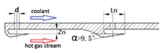 10] measured the temperature distribution of the surface of the inclined multi-hole film with an infrared thermal imager. The cooling effect can be effectively improved by reducing the spacing of holes and reducing the injection angle of holes to keep the film more attached to the wall. The experimental studies by Andrews et al. [