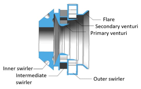 Figure 7, which consists of an inner swirler, an intermediate swirler (radial), an outer swirler (radial), a primary venturi, a secondary venturi, and a flare.