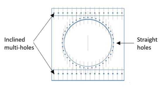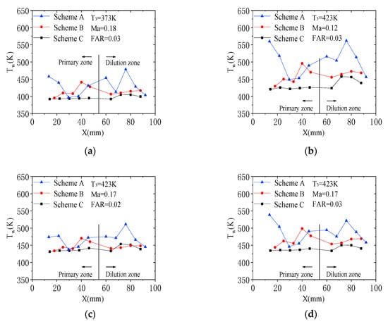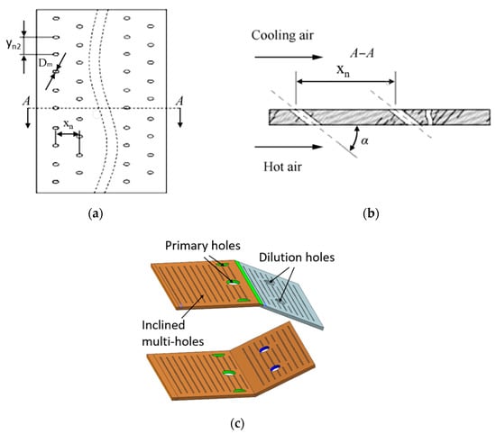 Figure 10). Scheme A, and B share the same cooling structure of the flame tube head as Scheme C. Furthermore, 30° multi-inclined holes and straight holes are adopted and the diameter of all the holes is 0.8 mm, as shown in
